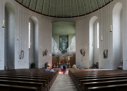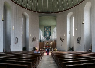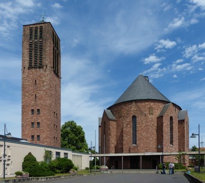 Stockstadt am Main liegt im Landkreis Aschaffenburg. Die architektonisch interessante Pfarrkirche mit dem ovalen Grundriss und freistehendem Turm wurde im Jahr 1952 eingeweiht.